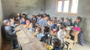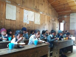 Nepalmed e. V. hat im Laufe der Jahre Schulküchen installiert, nebst PAUL-Wasserfilter, die für sauberes Trinkwasser sorgen. Der Einkauf der Lebensmittel wird gesponsert. Das so generierte Schulmittagessen wird sehr gut angenommen. Es ist ein Segen für die Kinder, weil es häufig die einzige warme Mahlzeit am Tag ist. Auch die Lehrer:innen sind sehr glücklich mit dieser Einrichtung: nun können sie auch noch nachmittags vernünftigen Unterricht halten!