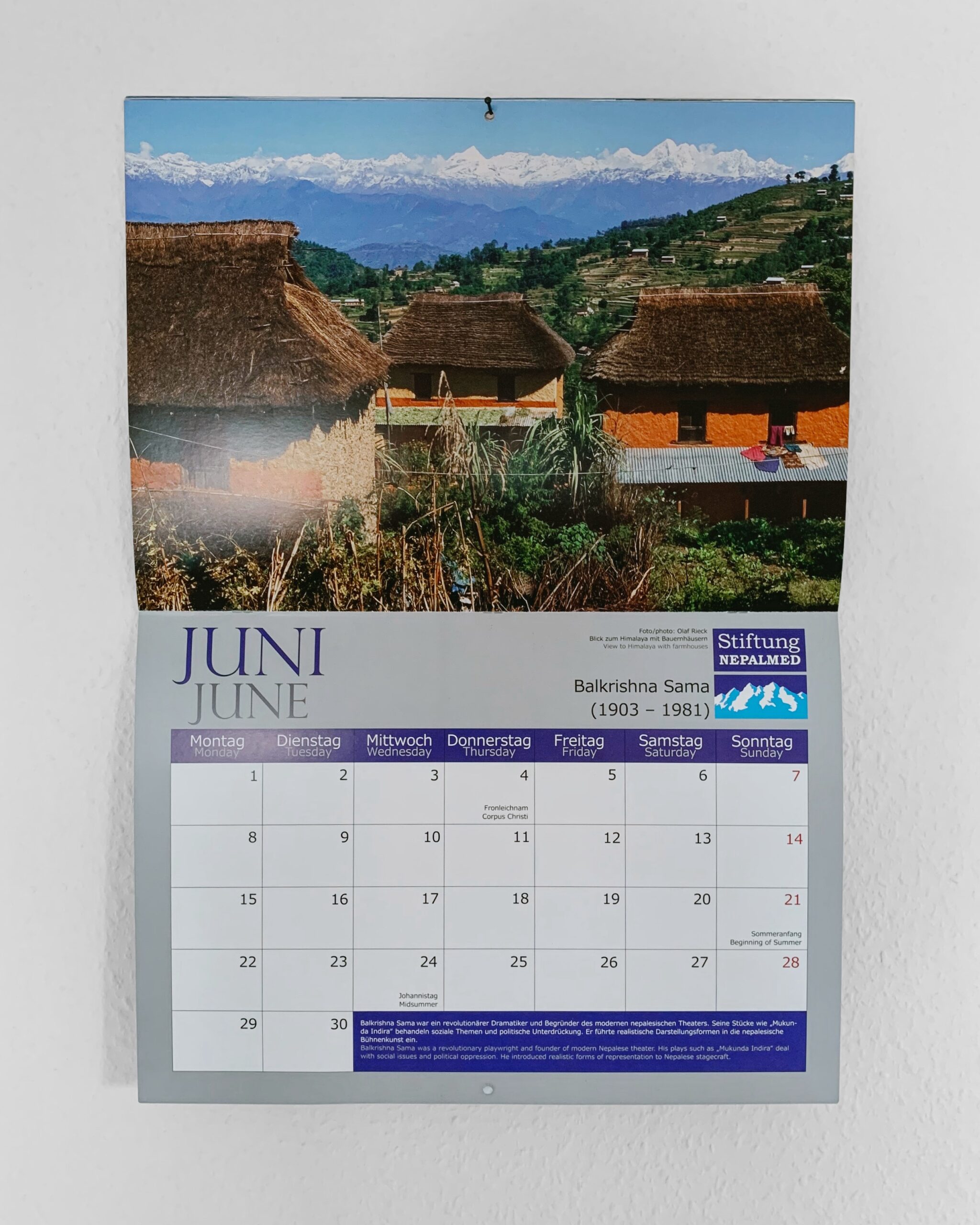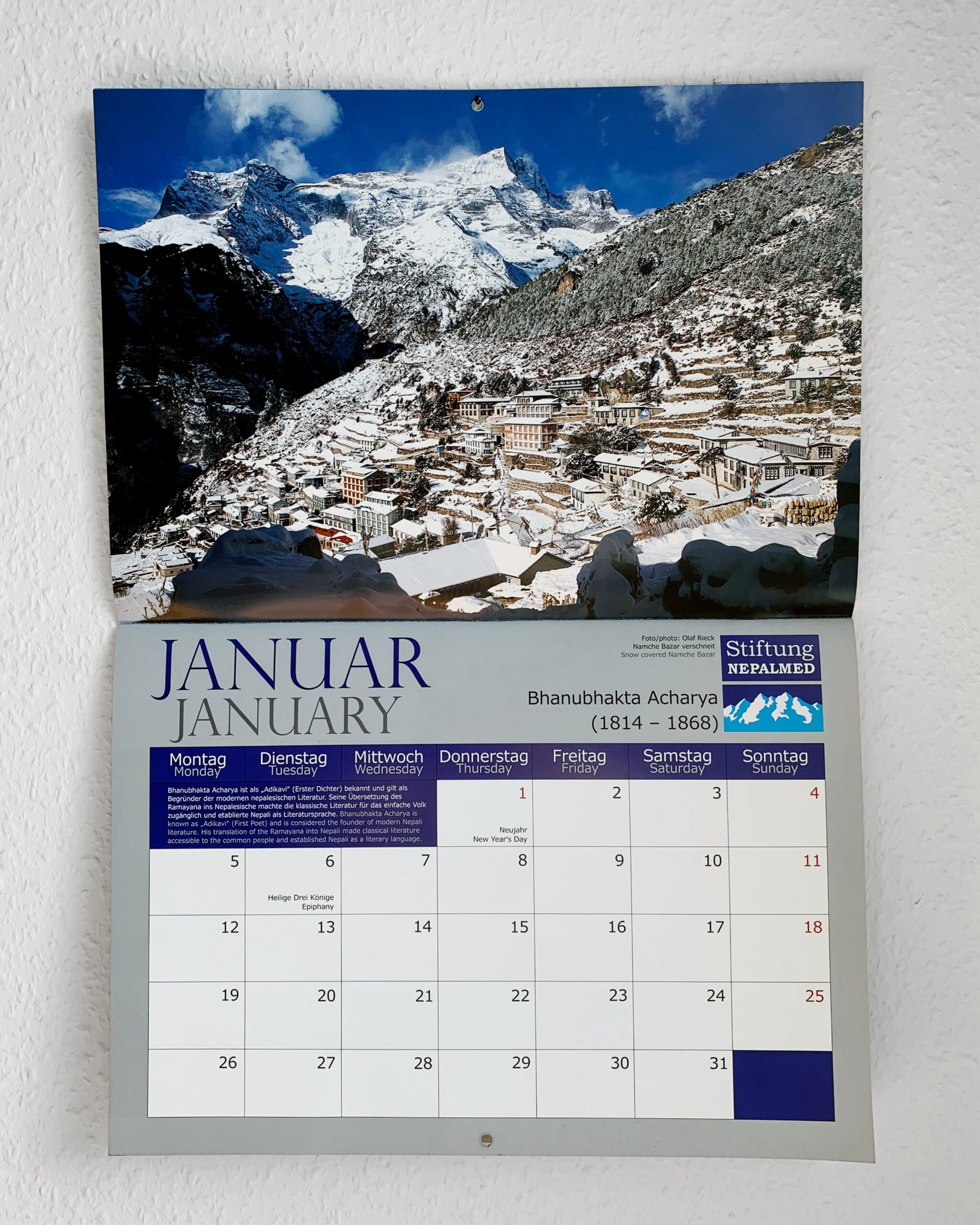 Mit dem Erlös aus dem Verkauf des Wandkalenders werden folgende Projekte unterstützt: Kathmandu Model Hospital, Kirtipur Hospital, Matrika Eye Center, Stupa Community Hospital, Bayalpata Hospital, Jajarkot Hospital, BPKIHS Dharan, Gesundheitsposten in Solukhumbu, Schulen und Gorkha Heritage Trek.